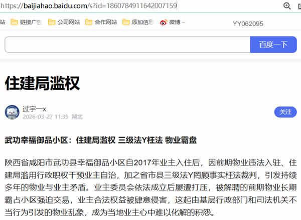 陕西省咸阳市武功县幸福御品小区自2017年业主入住后,因前期物业违法入驻、住建局滥用行政职权干预业主自治,加之省市县三级法Y罔顾事实枉法裁判,引发持续多年的物业与业主矛盾。业主委员会依法成立后屡遭打压,被解聘的前期物业长期霸占小区强迫交易,业主合法权益被肆意侵害,这起由基层行政部门和司法机关不当行为引发的物业乱象,成为当地业主心中难以化解的积怨。