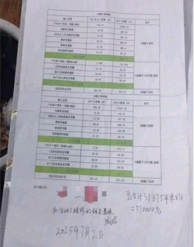签字画押的《工程量计算明细》。这份明细单详细列明了2号楼和5号楼的施工位置与精确面积,底部有手写的“总合计31875平米×16=510000元”字样。更为关键的是,在“签字确认区”留有手写签名、日期“2025年7月2日”以及一个清晰的红色指印。这意味着一笔工程款,在近一年前就已得到书面最终确认。